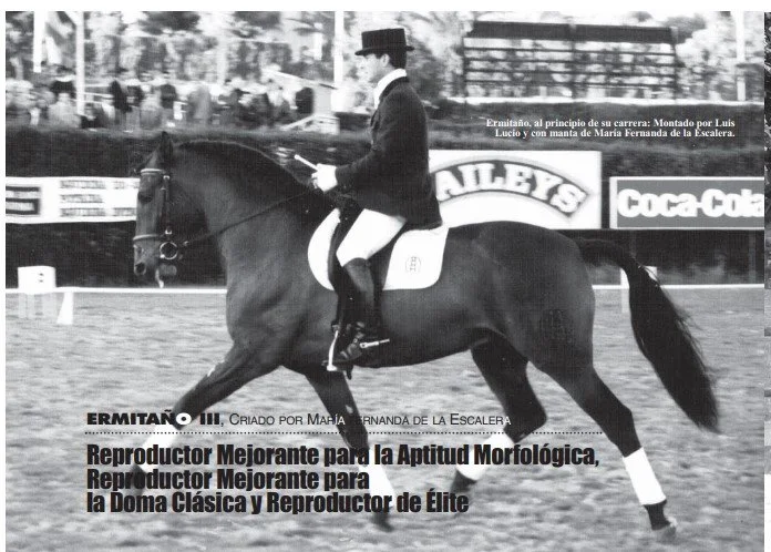 I've been able to train and observe many of Ermitaño sons, in the vast majority of them; he has left marked traits of his natural balance, the amplitude and mobility of his gallop and a high quality." He left a before and after mark in tests in which he participated and has left an enormous and valuable offspring, which will certainly reap great successes in the world of dressage. I am very proud of having had the privilege of training horses of such great quality. Horses like Ermitaño certainly make great riders.